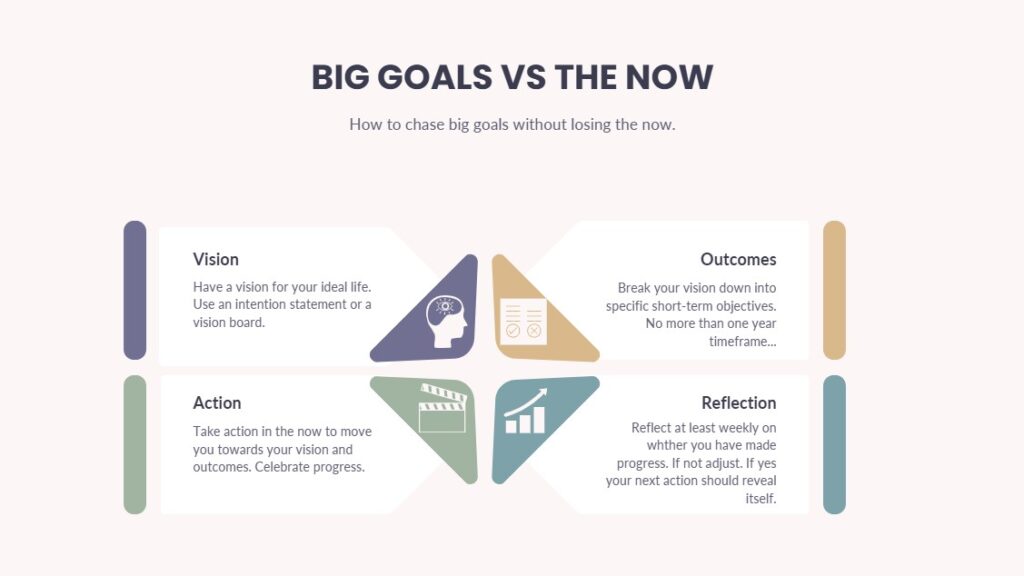 No, I quickly realised that living just in the now wasn’t going to cut it. Sure, I saw and appreciated stopping to appreciate those moments that make life rich, such as listening to birdsong, intimate moments, having a laugh with the friends or delighting in an infant’s laughter. There must be some way of combining the benefits of goal setting and living in the now? Well yes there is and after years of trial and error, I now use the following solution.